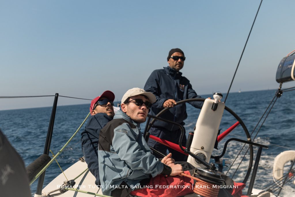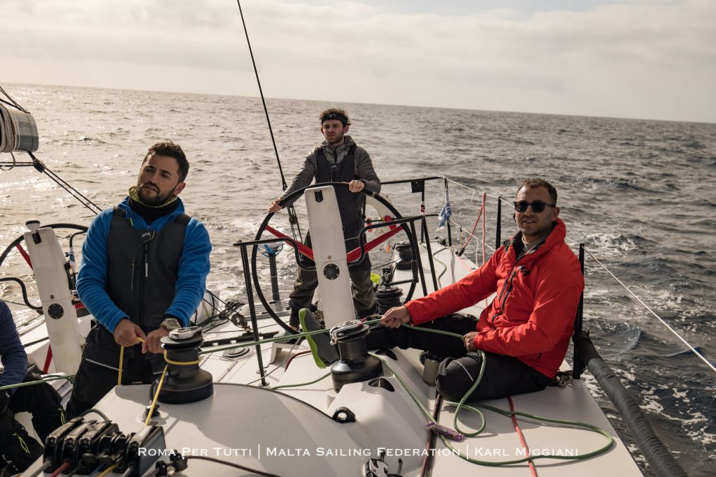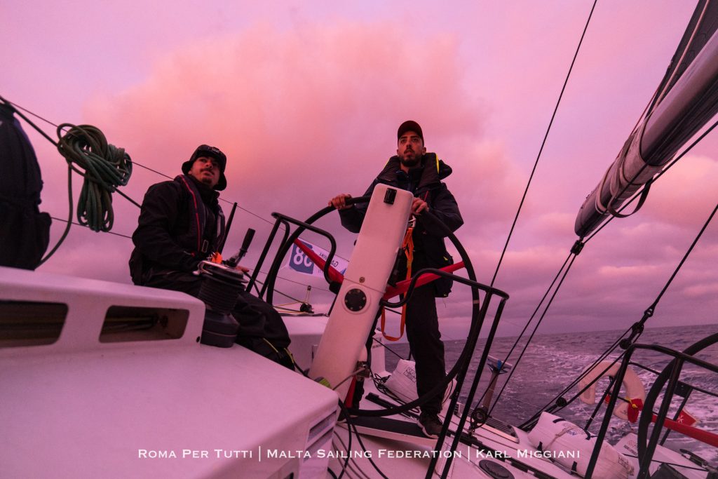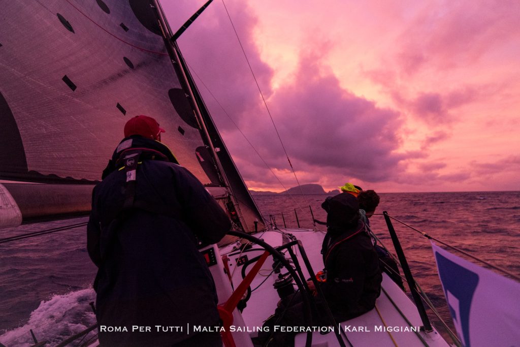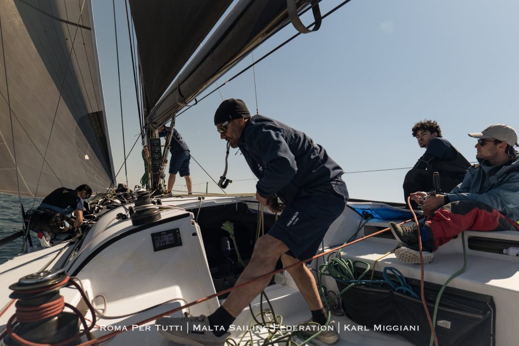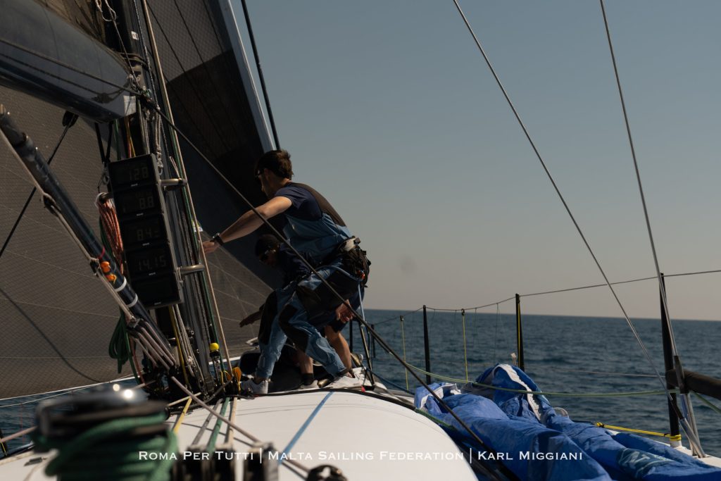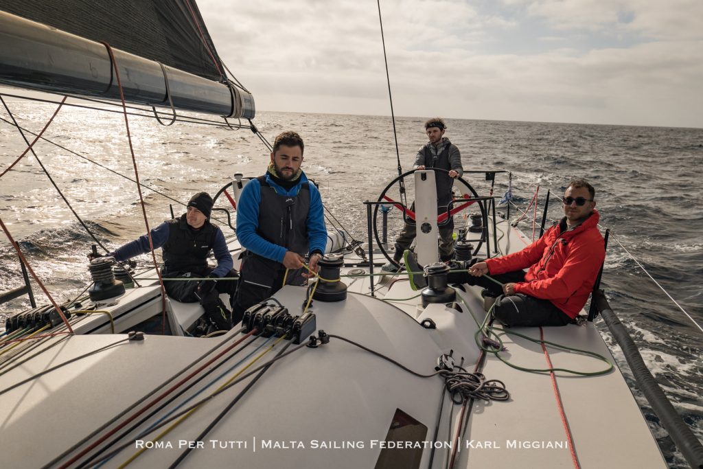 The race opened with a favourable southerly breeze at the start, which carried the fleet south in strong conditions for much of the early passage. Upwind, the crew faced gusts reaching 38 knots with seas running at 4 to 6 metres — severe conditions that accounted for retirements elsewhere in the fleet. Erring to the side of caution the Maltese crew kept the boat moving and pressed on when others could not.