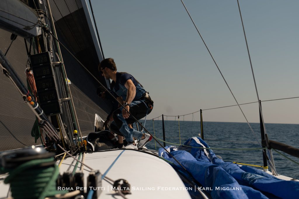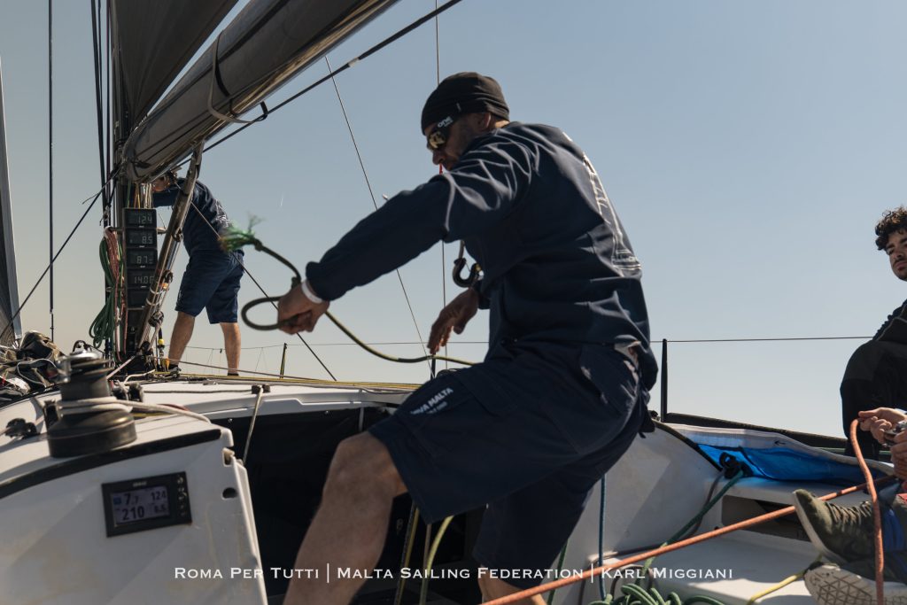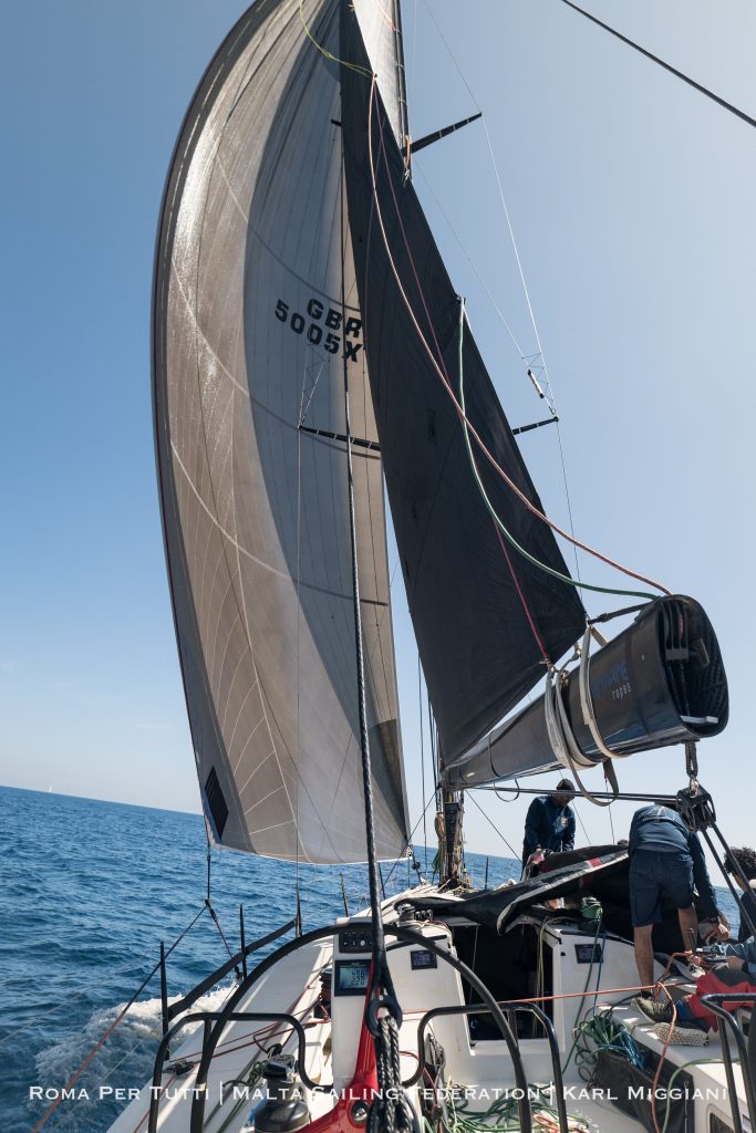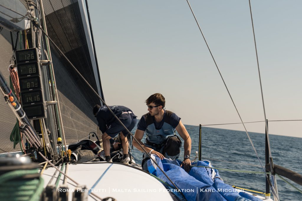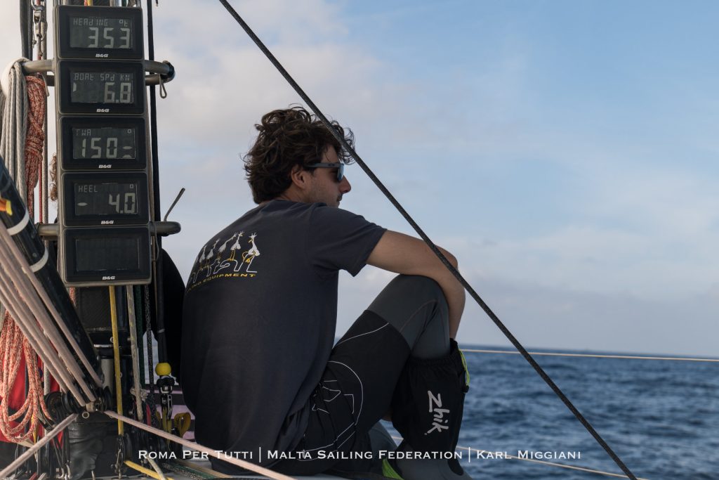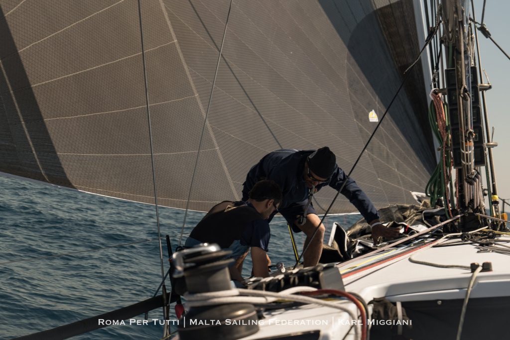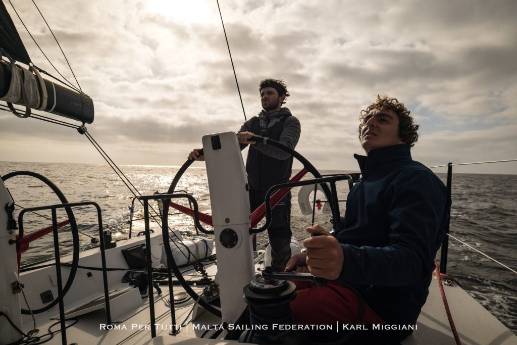 The race opened with a favourable southerly breeze at the start, which carried the fleet south in strong conditions for much of the early passage. Upwind, the crew faced gusts reaching 38 knots with seas running at 4 to 6 metres — severe conditions that accounted for retirements elsewhere in the fleet. Erring to the side of caution the Maltese crew kept the boat moving and pressed on when others could not.