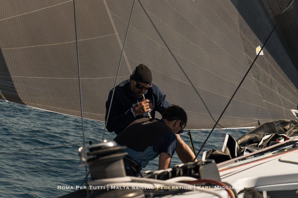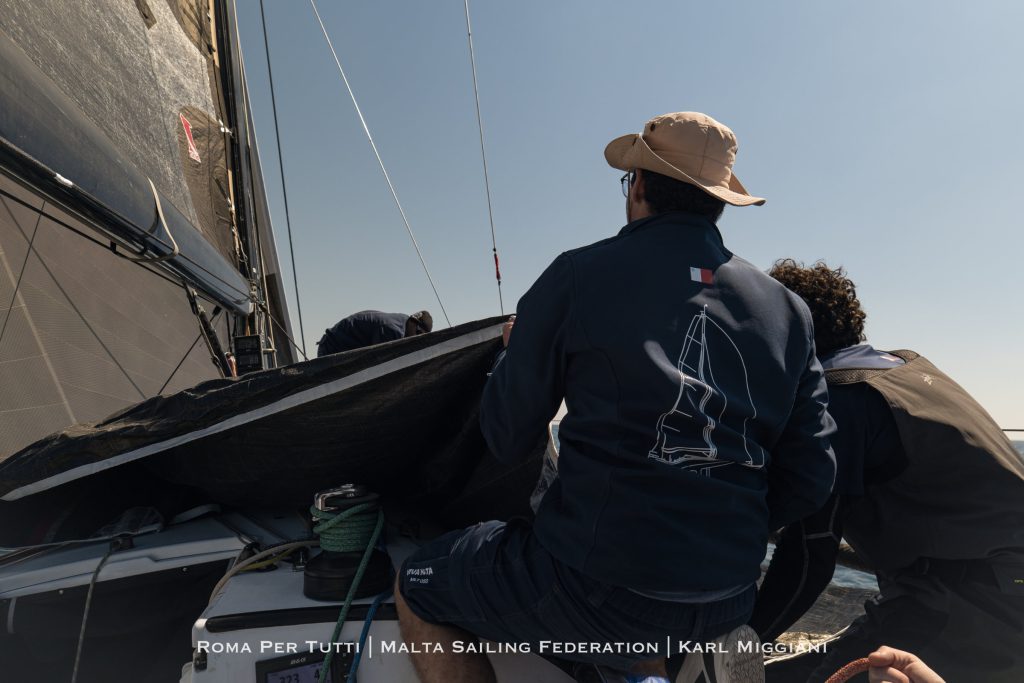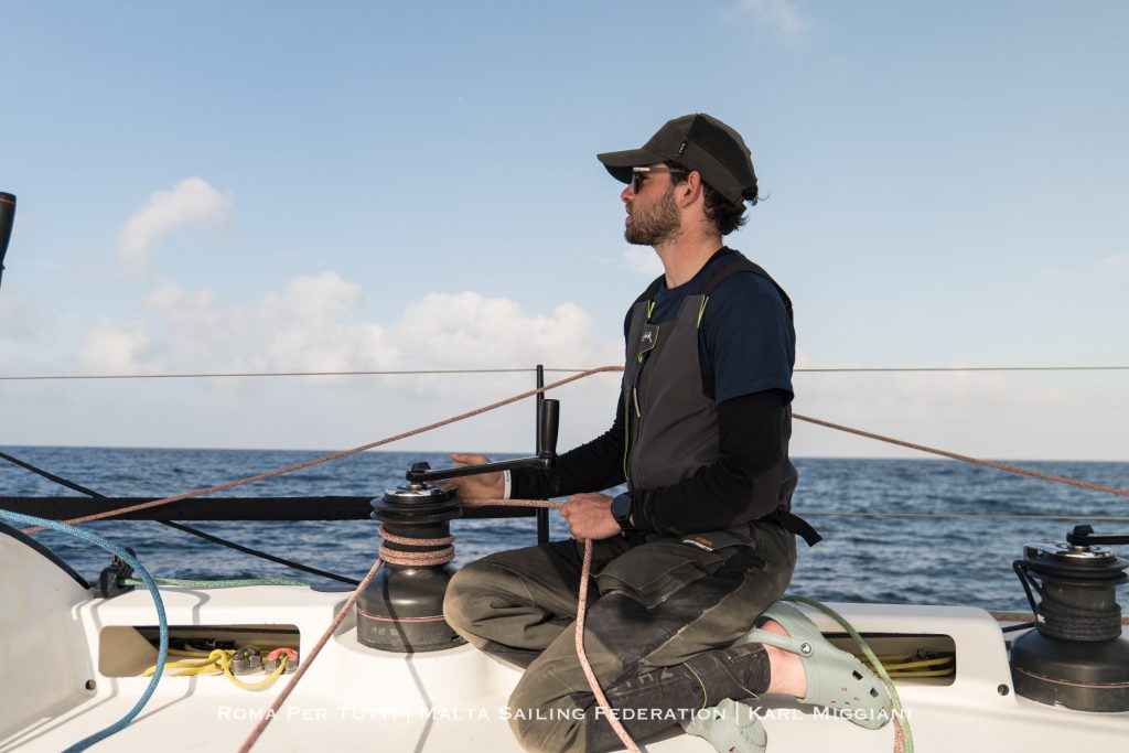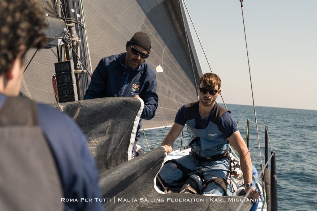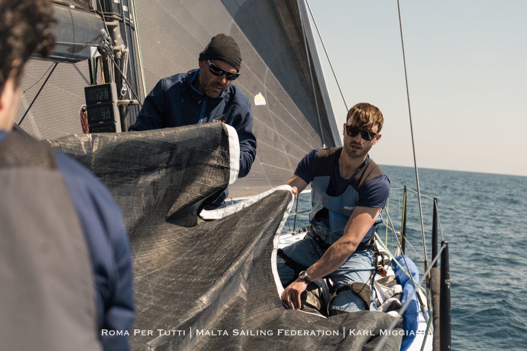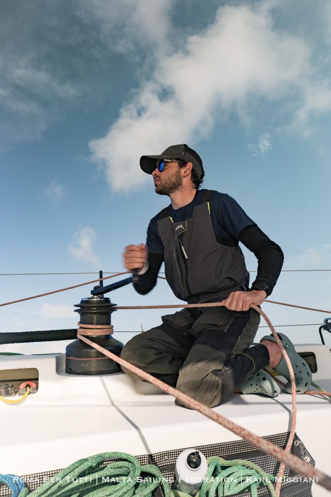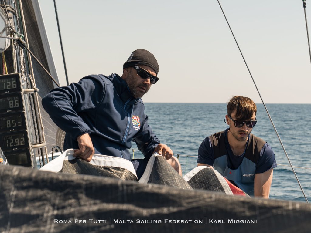 The race opened with a favourable southerly breeze at the start, which carried the fleet south in strong conditions for much of the early passage. Upwind, the crew faced gusts reaching 38 knots with seas running at 4 to 6 metres — severe conditions that accounted for retirements elsewhere in the fleet. Erring to the side of caution the Maltese crew kept the boat moving and pressed on when others could not.